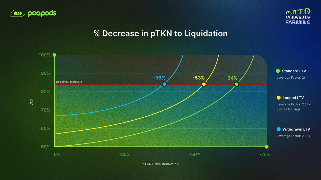 The following chart illustrates how different LVF configurations affect your liquidation buffer. It shows the **% decrease in pTKN required to reach liquidation**, based on different leverage profiles.